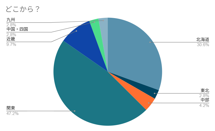 ・どこから?:北海道 30.6%、東北 2.8%、関東 47.2%、中部4.2%、近畿 9.7%、中国・四国2.8%、九州2.8%