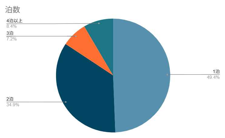 ・泊数:1泊 49.4%、2泊 34.9%、3泊7.2%、4泊以上 8.4%