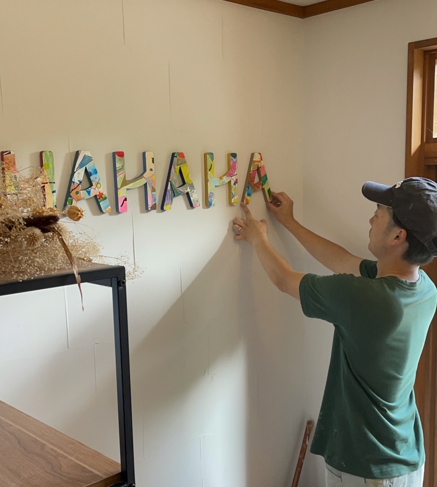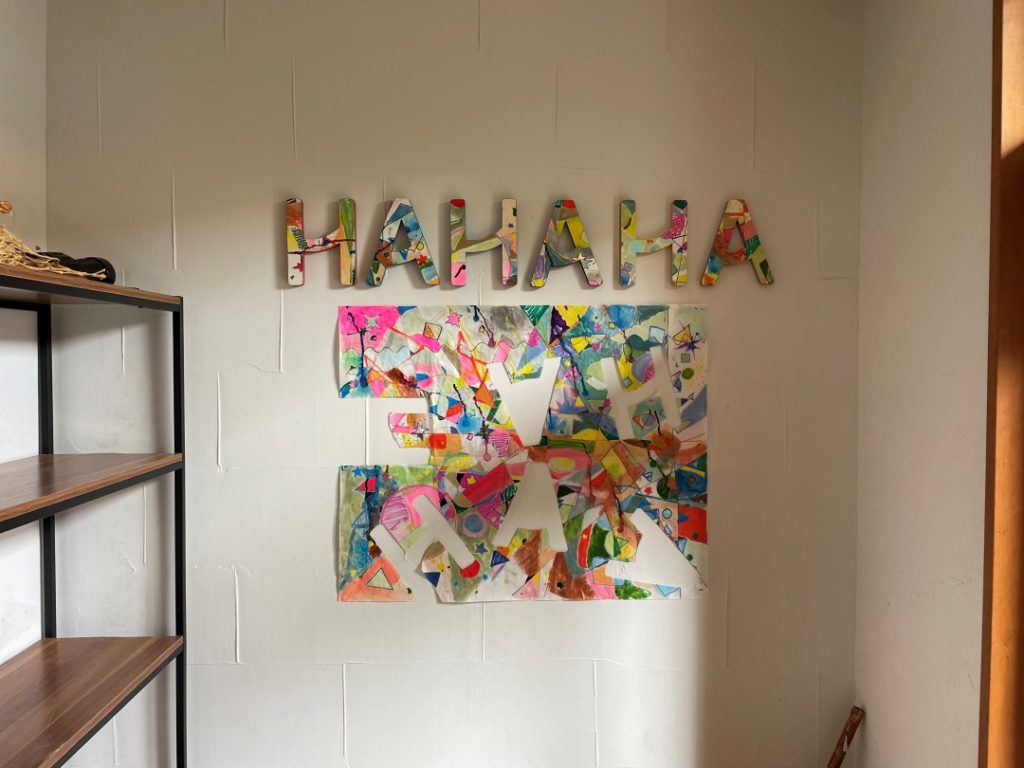 「HAHAHA」の下に貼っている大きな紙をよく見ると、「HAHAHA」の文字が見えませんか…?!一枚の紙にいろんな色を付けたあと、ピンとくるところを切り抜いてできた看板アートなんです。
