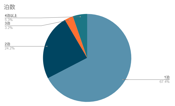 ・泊数:1泊 67.4%、2泊 24.2%、3泊 3.2%、4泊以上 5.3%