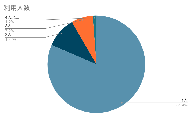 ・利用人数:1人 81.4%、2人 10.2%、3人 7.2%、4人以上 1.2%