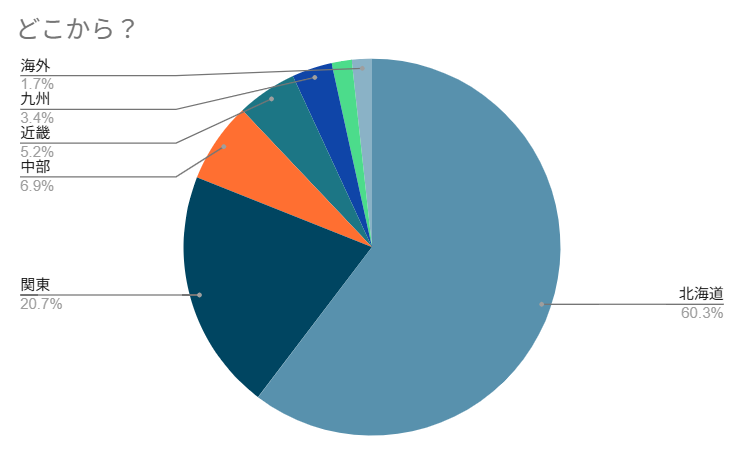 ・どこから?:北海道60.3%、関東20.7%、中部6.9%、近畿5.2%、九州3.4%、沖縄1.7%、海外1.7%
